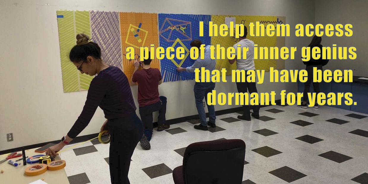 Introducing: Tape Art Workshops for high-achieving business professionals, In order to tap into the full potential of your team, I facilitate a workshop environment that welcomes any and all artistic expression. Harnessing my twenty years of experience as a University Professor of art and design, I lean into methods and media that even the most analytical thinkers can play with.